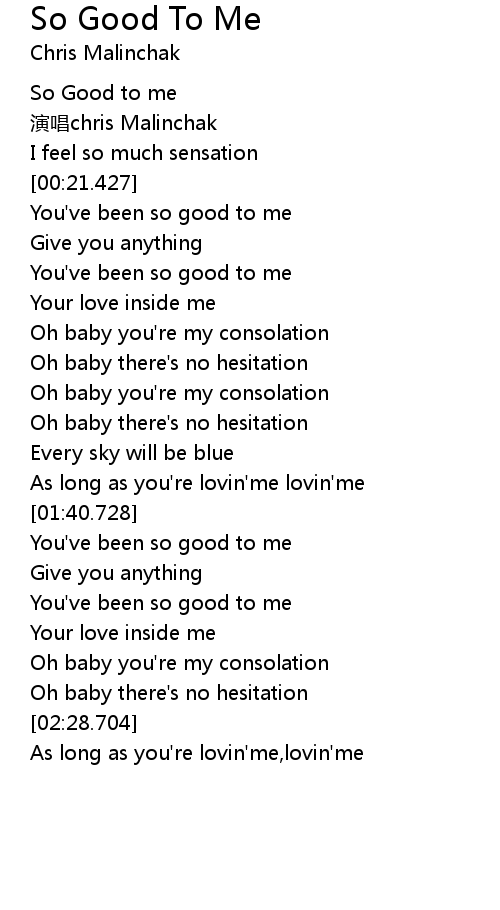 Youre so good to me baby. Youre kinda small And your such a doll Im glad youre mine Youre so good to me How come you are You take my hand And you understand When I get in a bad mood Youre so good to me And I love it love it Youre my baby oh yeah Dont mean maybe oh yeah I know your eyes Are not on ther guys When were apart Youre so true to me How come you are And every night You hold me so tight When I kiss. Oh baby theres no hesitation. I wanna drive you into the corner and kiss you without a sound.